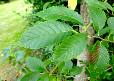 Die Blätter sind hell- bis mittelgrün und bleiben es bis weit in den Herbst hinein. Eine ausgeprägte Herbstfärbung gibt es nicht. Das einzelne, länglich-eiförmige ist Blatt bis 15 cm lang und bis 6 cm breit. Der Blattrand ist nicht sehr ausgeprägt gesägt. Die Spreitenbasis ist asymmetrisch, der Blattstiel weniger als 1 cm lang. Die Borke ist grünlich grau.